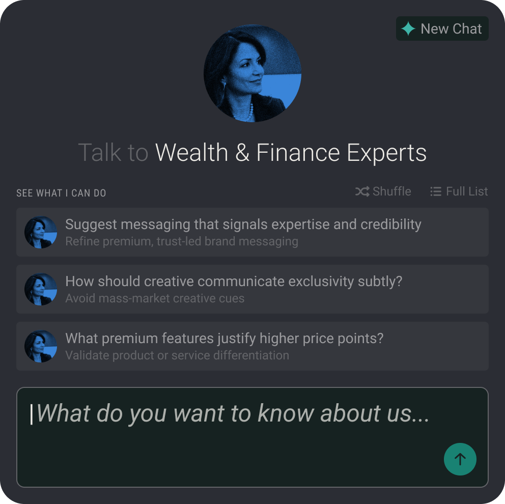 AudienceAI provides immediate insight into how UHNW audiences perceive brand value, exclusivity, heritage, and innovation. Ask natural-language questions to explore motivations, tone of voice, creative direction, and cultural cues that influence purchase decisions at the top of the market. You gain clarity on how to position products and experiences to resonate with both emotional desire and rational value.