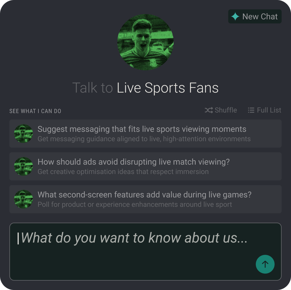 AudienceAI gives you on-demand answers to the questions that shape your campaigns. Explore fan motivations, preferred messaging, and the cultural trends driving interest in your sport, team, or brand. Ask any question and get immediate answers unique to your Tribes, that enable more personalised communication that drives deeper emotional connection.