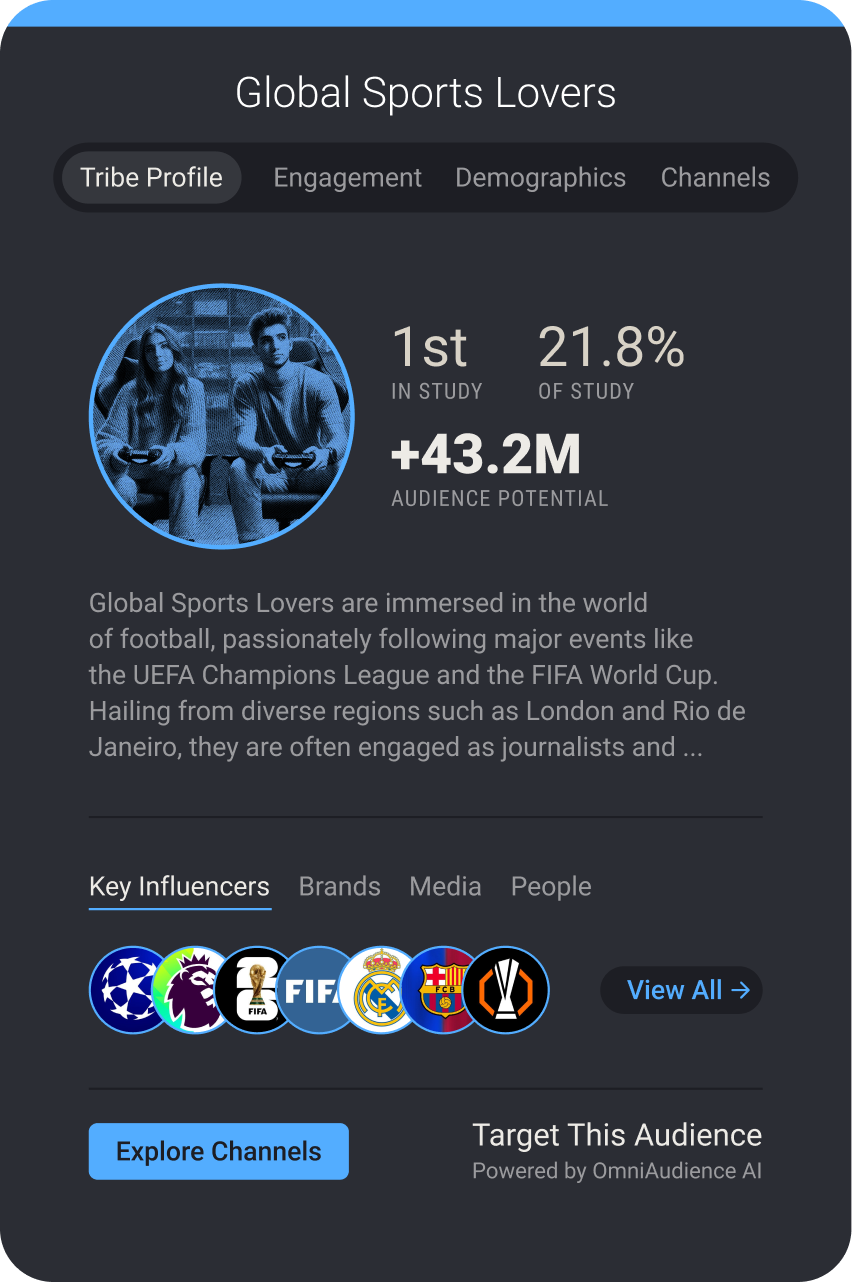 Fifty Tribes uses proprietary data built over a decade, and enabled by AI to identify highly specific fan tribes unique to each client, from "Global Sports Lovers" to "High-Octane Aficionados." This gives you a deep understanding of the audiences who influence attendance, loyalty, spend, and advocacy.